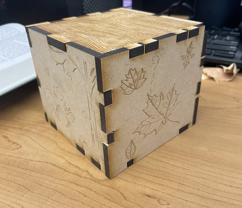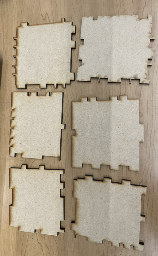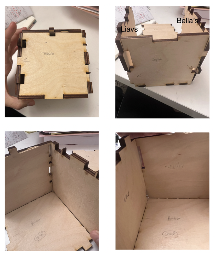 Our final product did not turn out exactly as we originally envisioned, and the project ended up being far more challenging than we initially expected. We encountered several issues throughout the process, especially during the test cuts, where many of the tabs and joints either failed to fit or were slightly too large or too small, making the assembly difficult. Through these challenges, we realized that clear and consistent communication was a key factor in getting the project to work, and working together helped us problem-solve and move forward. Overall, the experience was a valuable learning process, and next time we would focus more on refining our designs and considering all possible outcomes earlier, but we are still proud of what we accomplished as a team.