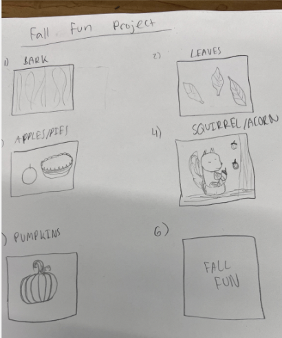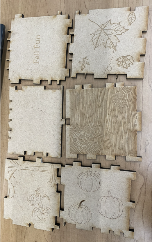My group included me, Sophia, Bella, Kevin, and Liav. First, we decided since summer just ended, we decided to do a fall-themed box. Each person would get one side to design and would have to make sure their side would fit with the surrounding sides.