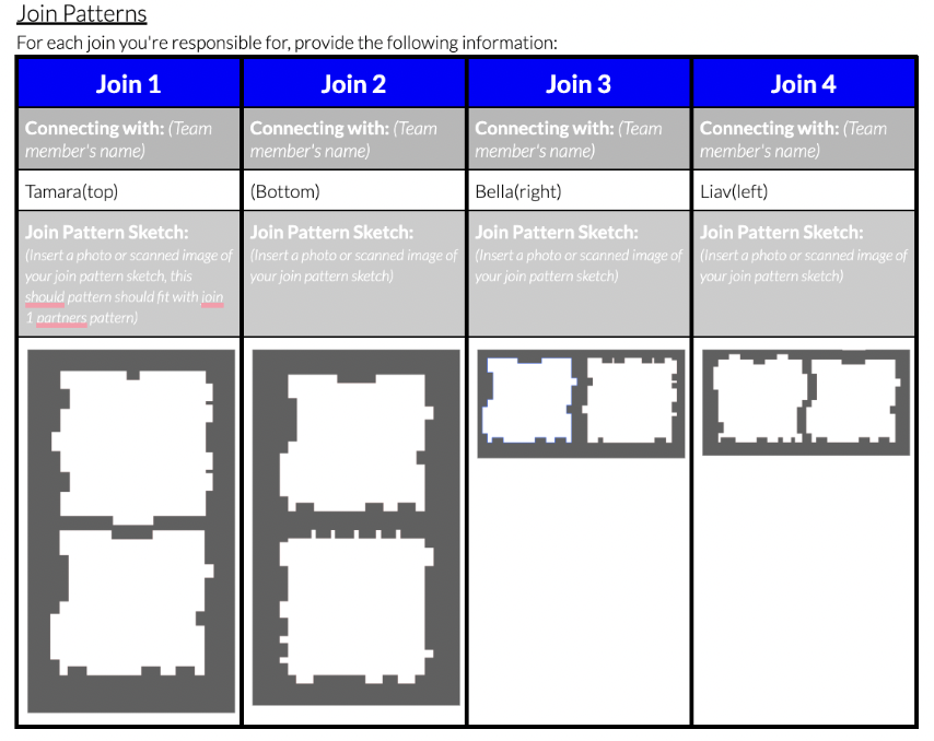 First, our main priority was to try to get the outlines of the sides to make sure our joins fit before we printed them with our designs. We first made all our joins, and we also made our designs for each side in a 4" x 4" square so that we could easily put it onto our fitting sides with the correct joins.